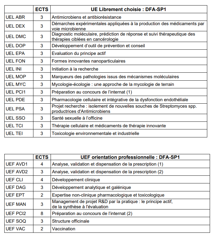 - Filière Officine : UEF AVD1, UEF AVD2, UEF SOQ, UEF VAC